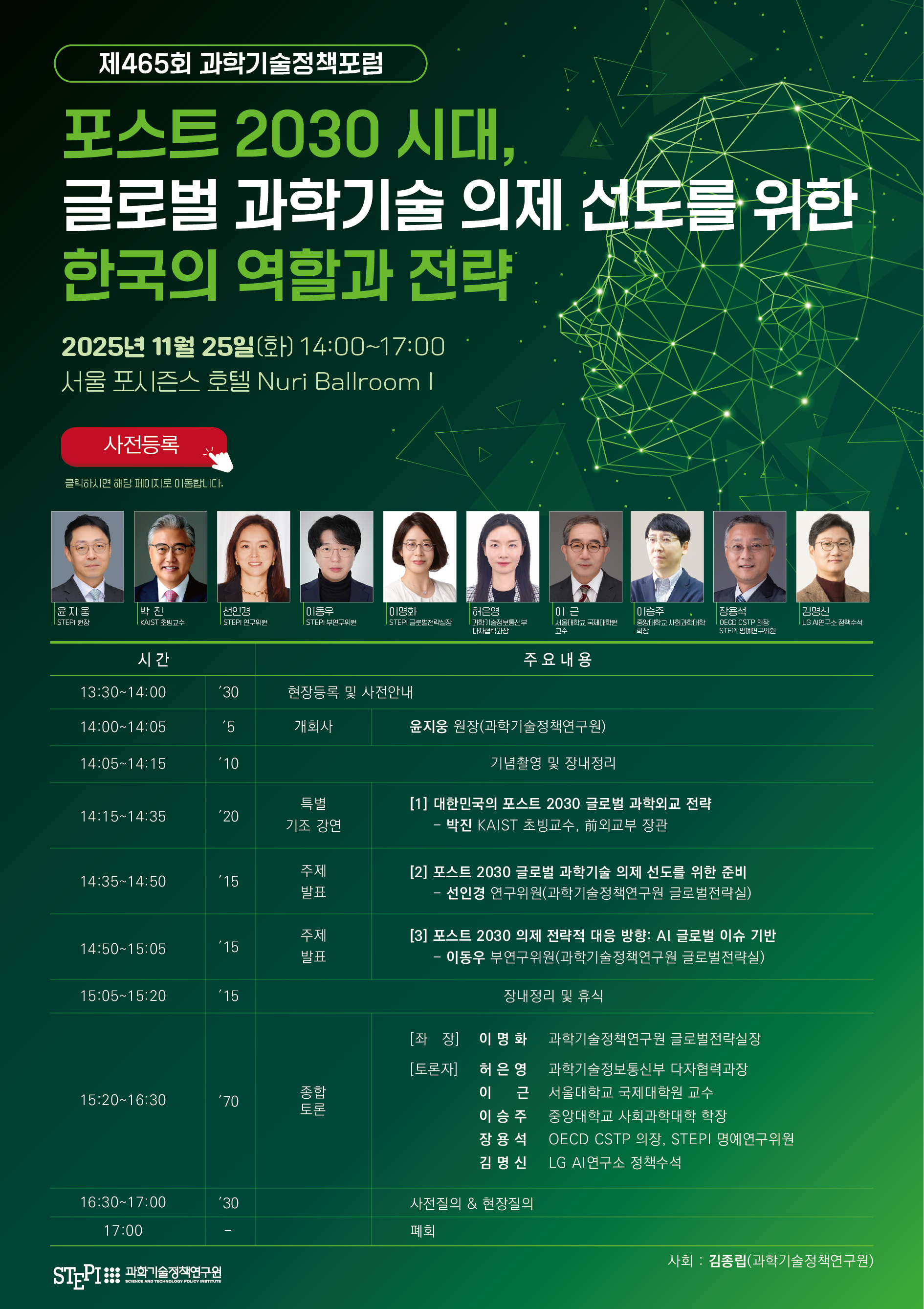 우리원은 지난 11월 25일(화) 오후 14시, 서울 포시즌스 호텔 Nuri Ballroom I(6층)에서 “포스트 2030 시대, 글로벌 과학기술 의제 선도를 위한 한국의 역할과 전략”이란 주제로 「제465회 과학기술정책포럼」을 개최했습니다.