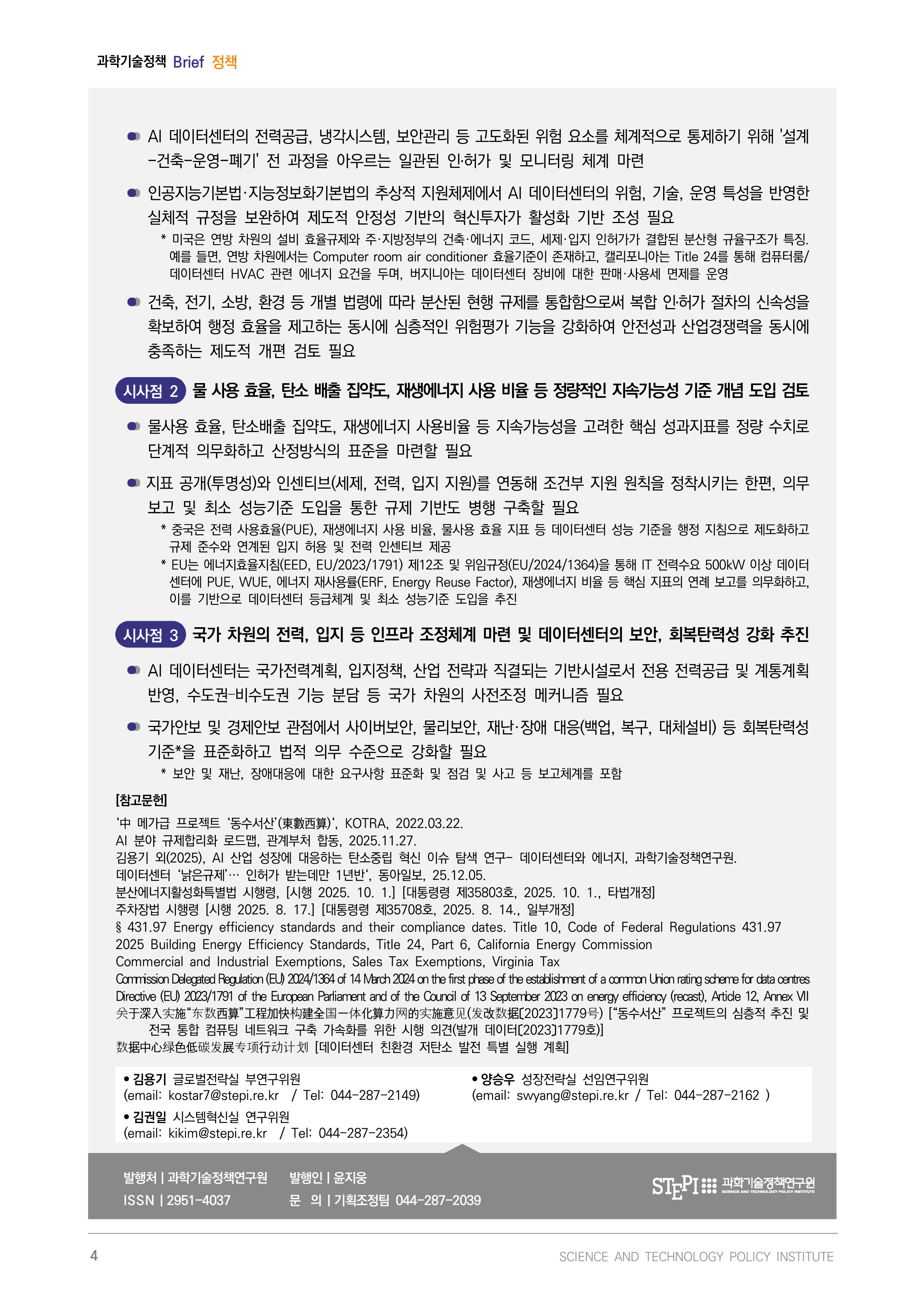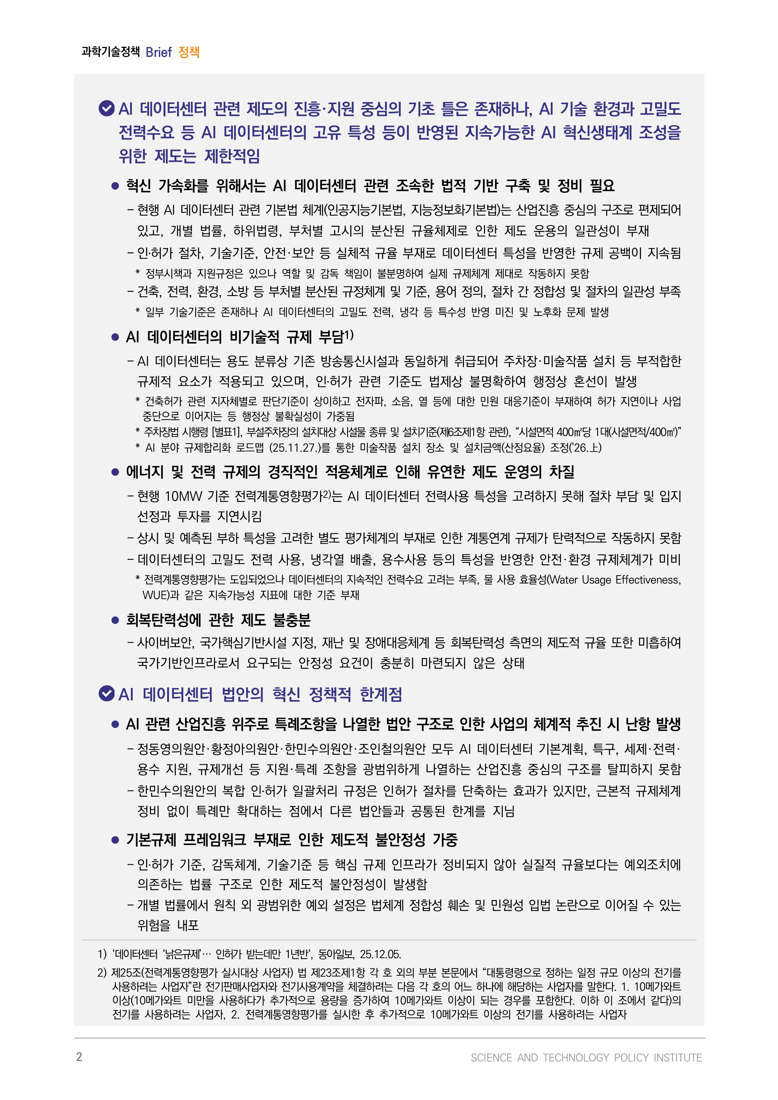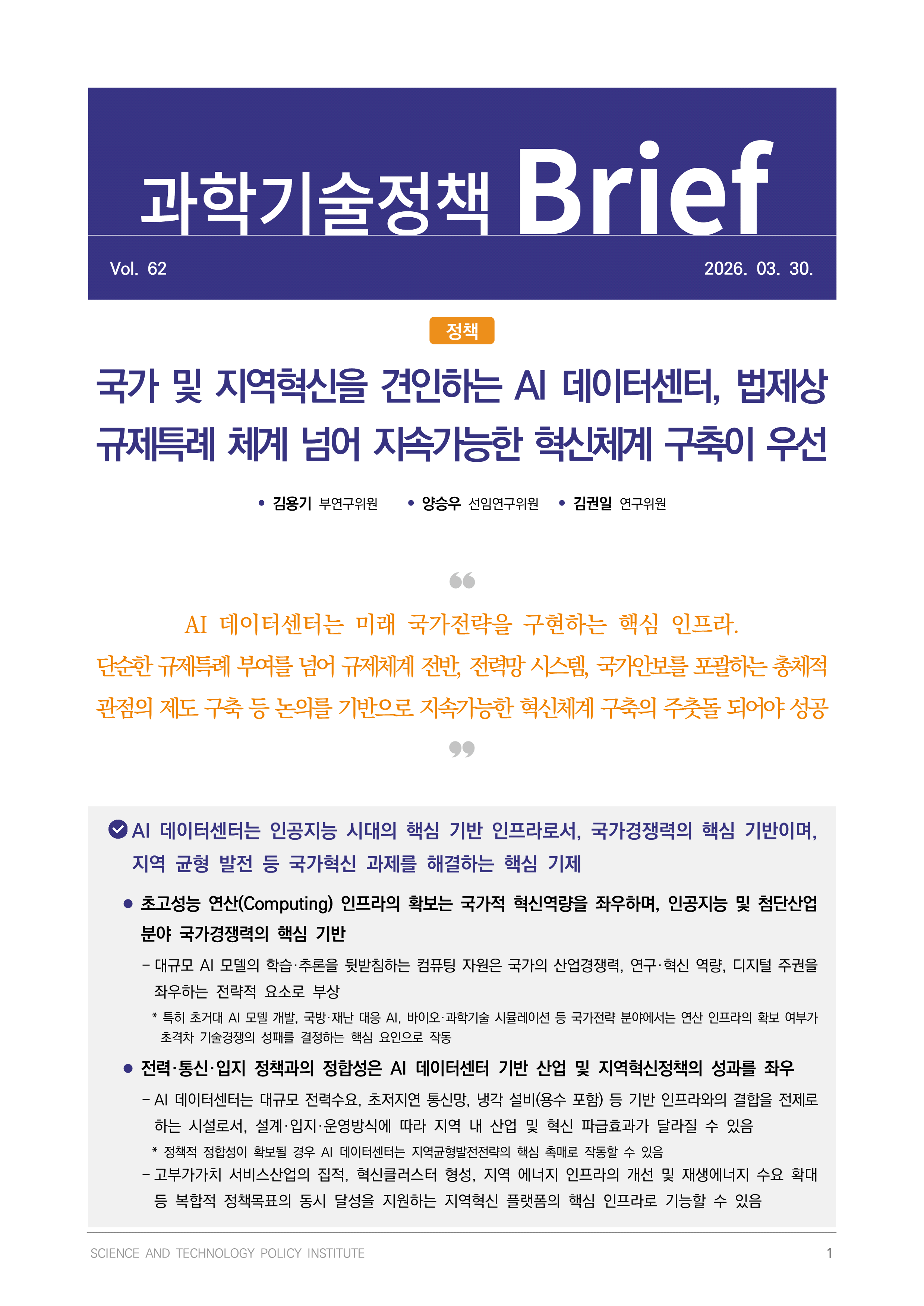 과학기술정책 Brief 국가 및 지역혁신을 견인하는 AI 데이터센터, 법제상 규제특례 체계 넘어 지속가능한 혁신체계 구축이 우선