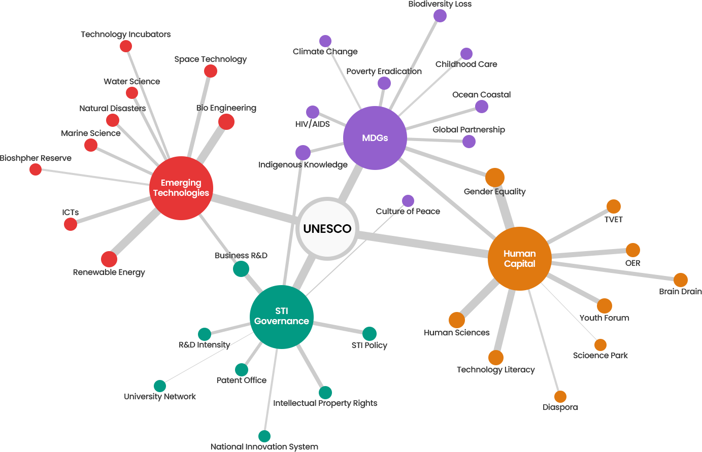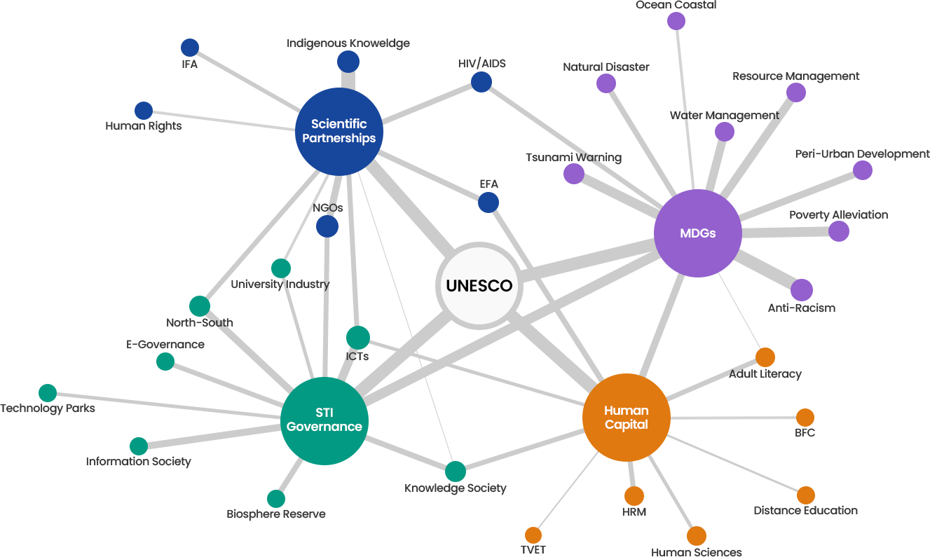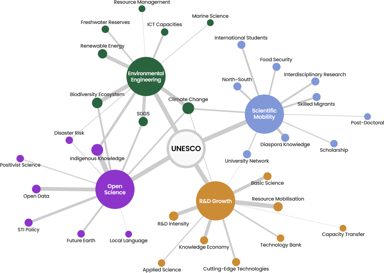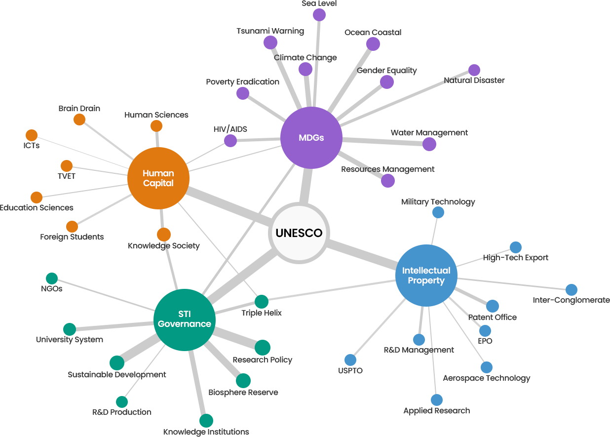 2010년대 전반 UNESCO 주요 토픽 클러스터 내 주요 특징은 다음과 같다. STI 거버넌스 측면에서는 역시 민간 주도의 비즈니스R&D가 상위 키워드로 도출된 가운데, 기업 수입 대비 R&D 투자비용으로 산출되는 기업 혁신지표인 R&D 집중도(R&D intensity)도 주요 키워드로 도출되며, 당시 STI 혁신 촉진 내 핵심주체는 민간기업이었음을 다시 한번 확인되었다.