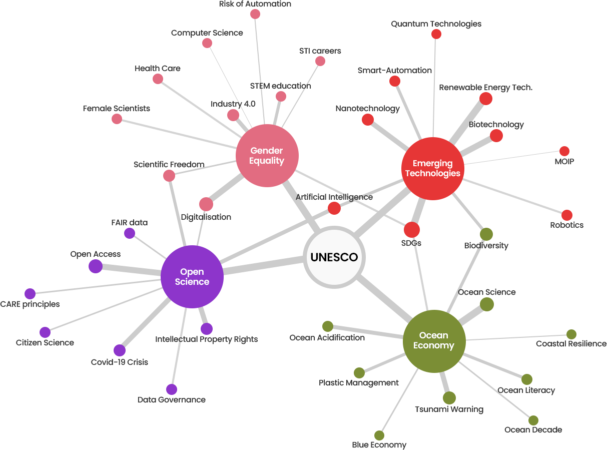 2021년 이후 UNESCO 토픽 클러스터 내 주요 특징은 다음과 같다. 오픈 사이언스 부문에서는 지적재산권, 데이터 거버넌스, FAIR 데이터 원칙 및 CARE 원칙 등이 주로 도출되며, 2021년 발표된 ‘유네스코 오픈 사이언스 권고’를 기반으로 보다 구체적인 프레임워크 이행 방안을 논의한다.