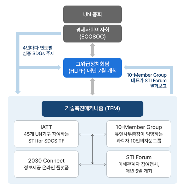 각국 정부, 국제기구, 민간 부문, 학계 등 다양한 이해관계자가 참여하는 대표적인 글로벌 STI for SDGs 협력 플랫폼으로, 정보 공유와 모범사례 확산을 통해 혁신적 해결책을 촉진합니다.